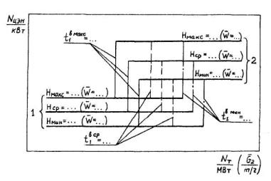 в диапазоне изменения электрической мощности (МВт) от Nт,1 до Nт,2