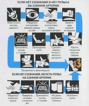 пульс на сонной артерии и информирует партнеров о состоянии пострадавшего: «Есть реакция зрачков! Нет пульса!