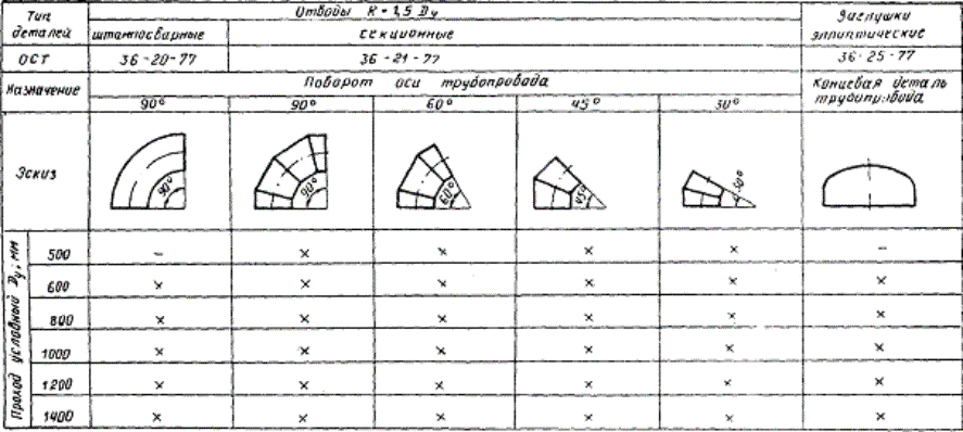 стандарт распространяется на сварные детали трубопроводов Dу 500 - 1400 мм из углеродистой стали на Pу £ 2,5 МПа (≈ 25 кгс/см2). 2. Детали