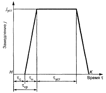 τс - время запаздывания тормозной системы; tн - время нарастания замедления; tуст - время торможения с
