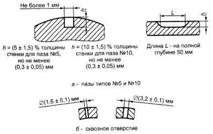 искусственных дефектов в контрольных образцах для сквозных отверстий: