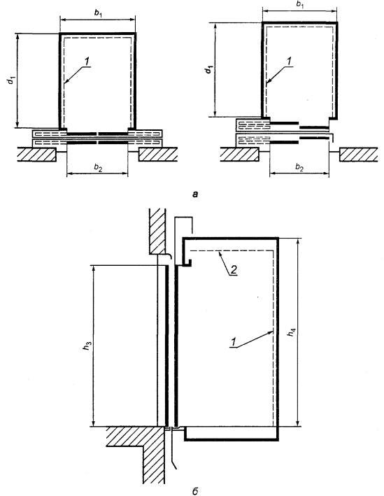 b1 - ширина кабины; b2 - ширина дверного проема; d1 - глубина кабины; h3 - высота дверного проема; h4 - высота кабины; 1