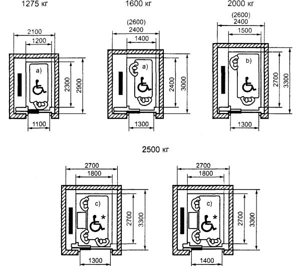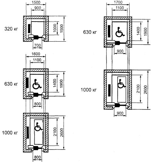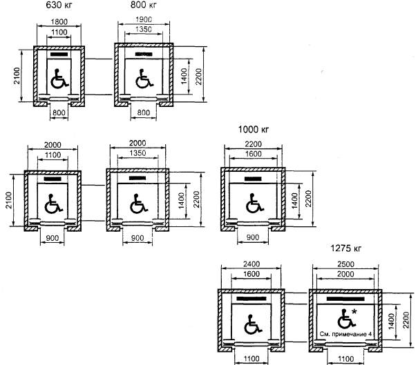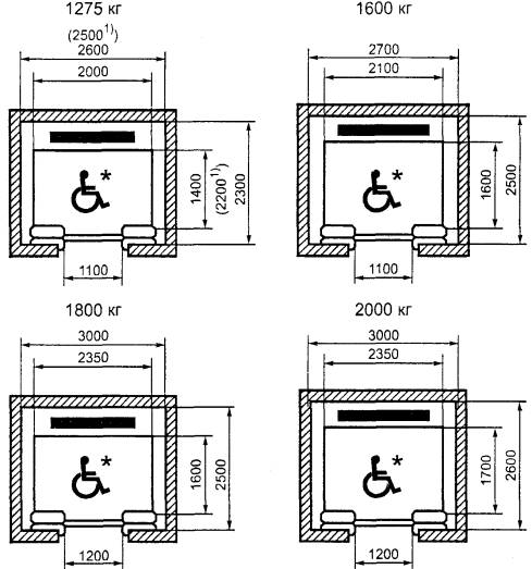 Примечания 1 Шахты лифтов скоростью более 2,50 м/с должны быть увеличены по ширине и глубине на 100 мм. 2 Лифты, обозначенные символом 3 Лифты, обозначенные символом 4 Лифты с кабинами в плане 1100 × 2100 мм доступны для транспортирования больного на носилках с убирающимися ручками (размер носилок 600 × 200 мм). Рисунок 4 - Пассажирские лифты для общественных и промышленных зданий