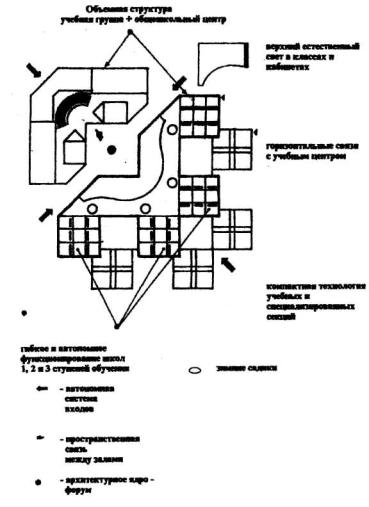 Программа проектирования современных общеобразовательных учреждений опирается на утвержденную Министерством образования и науки "Концепцию социально-функциональных требований к организации системы и проектирования общеобразовательной школы I, II и III ступеней обучения" в части альтернативной (авторской) программы, в которой содержатся педагогический, гигиенический, архитектурно-типологический и градостроительный аспекты.