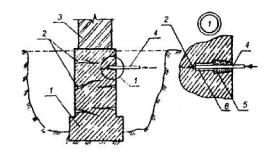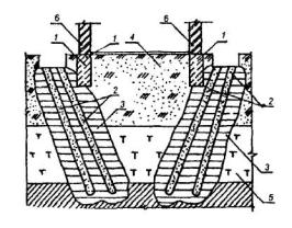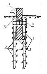 шагом 1-1,5 м; 5 - стыки свай; 6 - сколотая поверхность