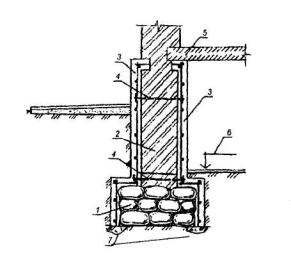 ЛЕНТОЧНОГО БУТОВОГО ИЛИ КИРПИЧНОГО ФУНДАМЕНТА 1 - усиливаемый бутовый фундамент; 2 - усиливаемая кирпичная стена; 3 - железобетонная обойма; 4 - анкеры; 5 - надподвальное перекрытие; 6 - отметка пола подвала; 7 - зона обжатого грунта