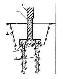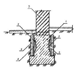 мм, устраиваемые через плитную часть усиливаемого фундамента; 3 - арматурные каркасы; 4 - конусные отверстия в плитной части фундамента; 5 - железобетонная колонна. Рис. 22. ПЕРЕДАЧА НАГРУЗКИ ОТ СТЕНЫ НА БУРОИНЪЕКЦИОННЫЕ СВАИ