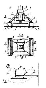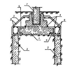 устроенных в фундаментах и разгружающих элементах; 4 - устройство для отжатия разгружающих элементов (домкраты,