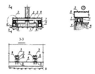 арматуры; 4 - основная рабочая арматура усиления; 5 - отметка пола подвала; 6 - сколотая поверхность бетона; 7 - выпуски арматуры в подушке; 8 - сварка; 9 - зоны уплотненного грунта. Рис. 16. УСТРОЙСТВО ЖЕЛЕЗОБЕТОННЫХ ПРИЛИВОВ