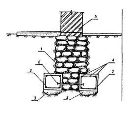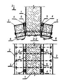 1 - подколенная часть фундамента; 2 - колонна; 3 - железобетонная обойма усиления подколонной части фундамента; 4 - поперечные арматурные сетки обоймы; 5 - вертикальные арматурные стержни обоймы; 6 - поверхность подколонника, подготовленная к бетонированию (зачистка и насечка). Рис. 6. УСТРОЙСТВО ЗАЩИТНЫХ СТЕНОК 1 - усиливаемый фундамент; 2 - участки разрушения в результате действия агрессивной