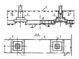уплотнением после вдавливания свай. Рис. 30. ПЕРЕДАЧА НАГРУЗКИ ОТ СТЕНЫ НА СОСТАВНЫЕ ЖЕЛЕЗОБЕТОННЫЕ СВАИ, ПОГРУЖАЕМЫЕ ВДАВЛИВАНИЕМ 1 - усиливаемый фундамент; 2 - звенья составных железобетонных свай; 3 - железобетонные балки, устраиваемые вдоль стены здания; 4 - железобетонные монолитные перемычки, устраиваемые с