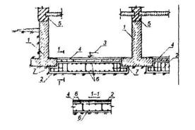фундаменты; 2 - монолитные железобетонные плиты; 3 - поверхность пола; 4 - арматурные каркасы. Рис.11. ПЕРЕУСТРОЙСТВО ЛЕНТОЧНЫХ ФУНДАМЕНТОВ В ПЛИТНЫЕ (УСТРОЙСТВО МОНОЛИТНЫХ ЖЕЛЕЗОБЕТОННЫХ ПЛИТ) 1 - усиливаемый ленточный фундамент; 2 - сплошная (прерывистая) плита; 3 - отметка поверхности пола подвала; 4 - уплотненный крупный песок; 5 - кирпичная стена; 6 - рабочая арматура плиты усиления; 7 - поверхность фундамента,