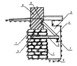 восстановления участков разрушения; 4 - обмазочная или оклеечная гидроизоляция; 5 - кирпичная стена. Рис. 7. УСТАНОВКА ПОДКОСОВ С ЗАТЯЖКАМИ 1 - усиливаемый фундамент; 2 - элементы усиления фундамента; 3 - металлическая или железобетонная обойма вокруг колонны; 4 - подкос из прокатного металла; 5 - опора подкосов из уголка; 6 - затяжка; 7 - пластина-подкладка; 8 - муфта натяжения; 9 - зона обжатого грунта