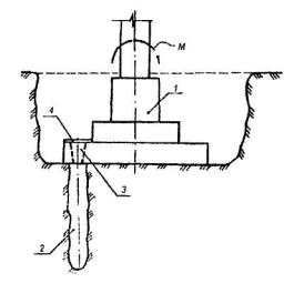 1 - усиливаемый фундамент; 2 - буронабивные сваи; 3 - железобетонная обойма; 4 - поверхность фундамента, подготовленная к бетонированию