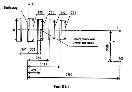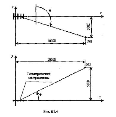 Исходные данные. Техническое средство - антенна, аналогичная рассмотренной в примере 1, при той же мощности излучения и частоте. Требуется рассчитать уровень ЭМП, создаваемого антенной в точке М1 с координатами: х = 10 м, у = 5 м, z = -3 м (см. рис. П1.4). Учитывать влияние металлоконструкций и подстилающей поверхности не требуется.