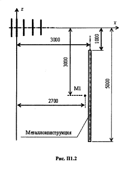 Исходные данные. Техническое средство - антенна, аналогичная рассмотренной в примере 1, при той же мощности излучения и частоте. Требуется рассчитать уровень ЭМП, создаваемого антенной в точке М1 с координатами: х = 2,7 м, у = 0, z = -3 м (та же точка, что и в примере 1). При этом необходимо учесть влияние металлоконструкции и подстилающей поверхности. Параметры металлоконструкции - те же, что в примере 2, параметры подстилающей поверхности - те же, что в примере 3.