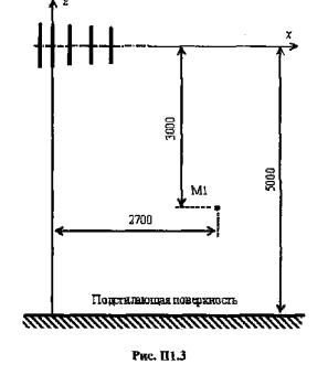 Исходные данные. Техническое средство - антенна, аналогичная рассмотренной в примере 1, при той же мощности излучения и частоте. Требуется рассчитать уровень ЭМП, создаваемого антенной в точке М1 с координатами: х = 2,7 м, у = 0, z = -3 м (та же точка, что и в примере 1). При этом необходимо учесть влияние подстилающей поверхности, расположенной в плоскости z =-5 м (см. рис. П1.3). Параметры среды под подстилающей поверхностью: относительная магнитная проницаемость μ = 1; относительная диэлектрическая проницаемость ε = 15; удельная проводимость σ = 0,015 Ом/м. Учитывать влияние металлоконструкций не требуется.