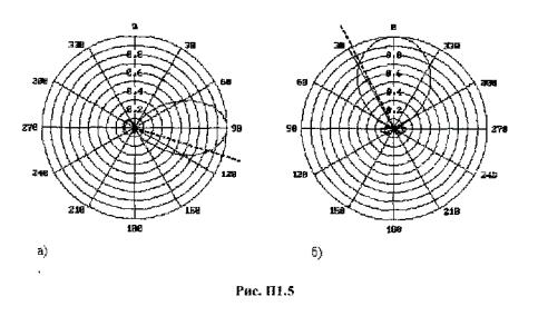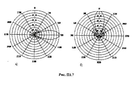 вектор Е - по формуле (2.24). Расчетная нормированная ДН в вертикальной плоскости приведена на рис. П1.5(а), расчетная нормированная ДН в горизонтальной плоскости - на рис. П1.5(б); там же штриховыми линиями показаны направления на точку наблюдения М1. Значения нормированных ДН в направлении на точку М1: