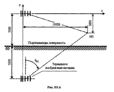 Исходные данные. Техническое средство - антенна, аналогичная рассмотренной в примере 1, при той же мощности излучения и частоте. Требуется рассчитать уровень ЭМП, создаваемого антенной в точке М1 с координатами: х = 10 м, у = 5, z = -3 м (та же точка, что и примере 5). При этом необходимо учесть влияние подстилающей поверхности, расположенной в плоскости х = -5 м (см. рис. П1.6). Параметры среды под подстилающей поверхностью - те же, что и в примере 3. Учитывать влияние металлоконструкций не требуется.