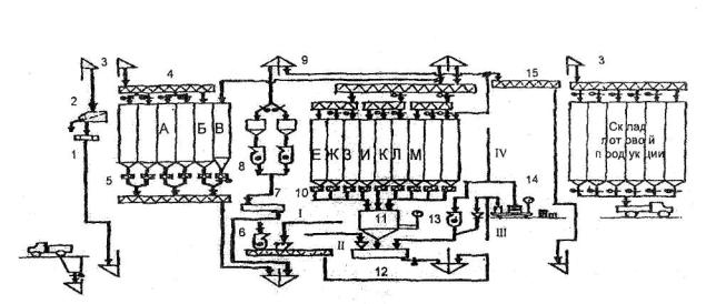 Условные обозначения технологических линий: I - трудносыпучего сырья; II - жидких компонентов; III - компонентов, не требующих измельчения; IV -
