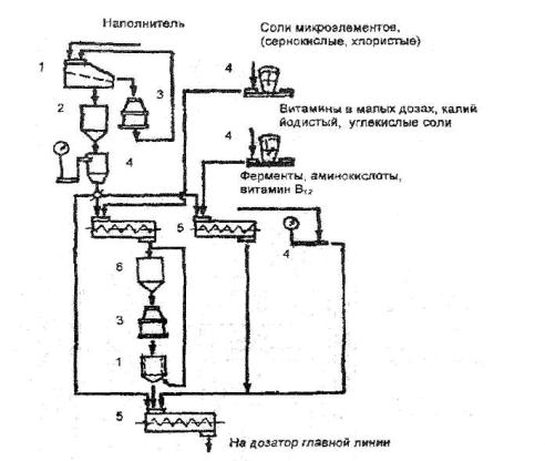 1 - бак для мелассы; 2,3,4- бункер-питатель; 5 - линия