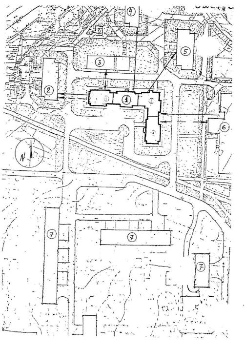 по естественному освещению (затемнению) подлежат также четыре здания 1; 2; 3; 6