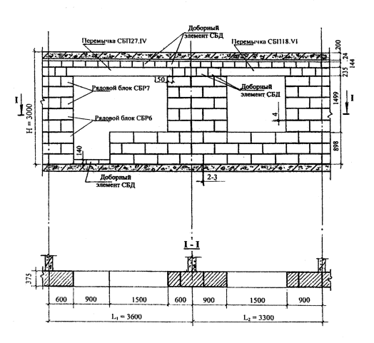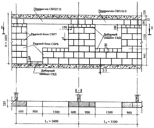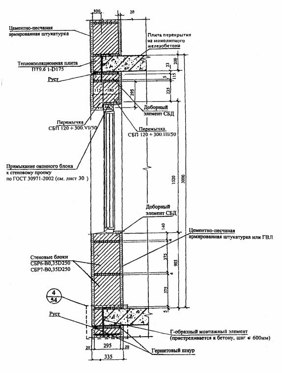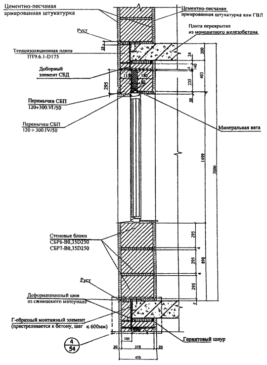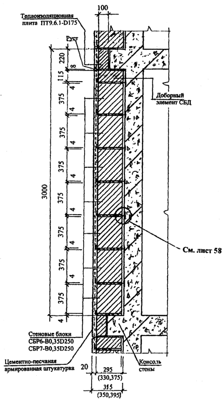 мм, перекрытие - монолитное железобетонное толщиной Полистиролбетонные блоки поэтажно монтируются на междуэтажных перекрытиях с неполным опиранием и вылетом консольной части, не превышающей 1/3 толщины блока. В стенах помимо полистиролбетонных блоков используются доборные элементы СДБ, которые изготавливаются по резательной технологии на дочернем предприятии института "ВНИИжелезобетон" - ЗАО "Юникон-ЗСК", или могут изготавливаться на строи тельной площадке резкой полистиролбетонных блоков или плит. В подоконной части стены толщиной 295 мм укладывается два ряда стеновых блоков и один ряд доборных элементов высотой 180 мм. При расчетной толщине указанных горизонтальных клеевых швов 5 и 4 мм общая высота подоконной части стены составляет 903 мм. При толщине стены 375 мм общая высота подоконной части будет равна 898 мм. В надоконной части стены при толщине стеновых блоков 295 мм укладываются две равновысокие перемычки высотой 295 мм или разновысокие перемычки высотой 295 мм (толщиной 115 мм) и высотой 235 мм (толщиной 180 мм). В надоконной части стены при толщине стеновых блоков 375 мм укладываются две равновысокие перемычки высотой 235 мм и один ряд доборных элементов высотой 140 мм. Функцию верхней четверти выполняют или штукатурный слой по низу наружной перемычки толщиной 30 мм, или перемычка толщиной 115 мм. Между перекрытиями и расположенными ниже полистиролбетонными