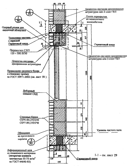 НОРМАЛЬ Н3. НЕНЕСУЩАЯ СТЕНА ИЗ ПОЛИСТИРОЛБЕТОННЫХ БЛОКОВ ТОЛЩИНОЙ 375 мм И ВЫСОТОЙ 295 мм С КИРПИЧНОЙ ОБЛИЦОВКОЙ ФАСАДА (ВЕРТИКАЛЬНЫЙ РАЗРЕЗ ПО ОКНУ)