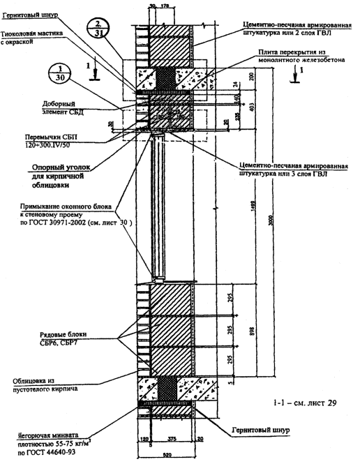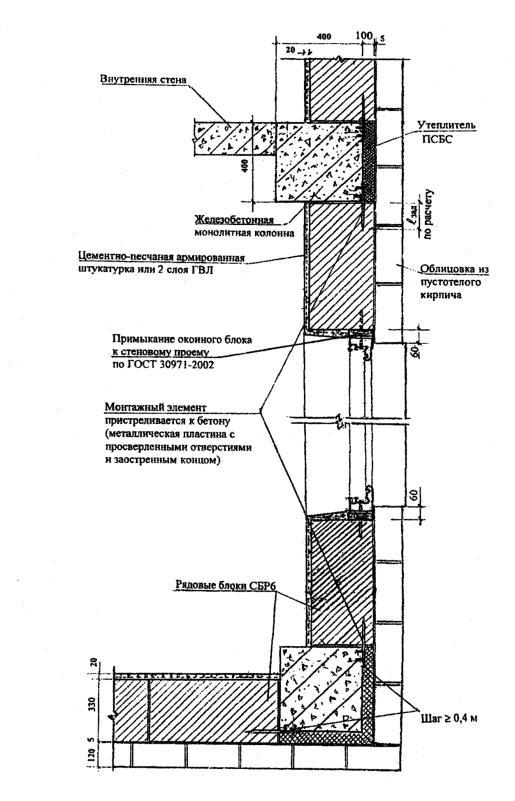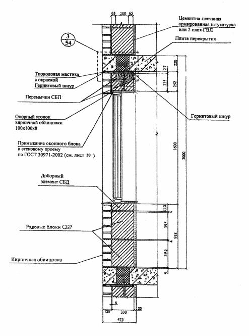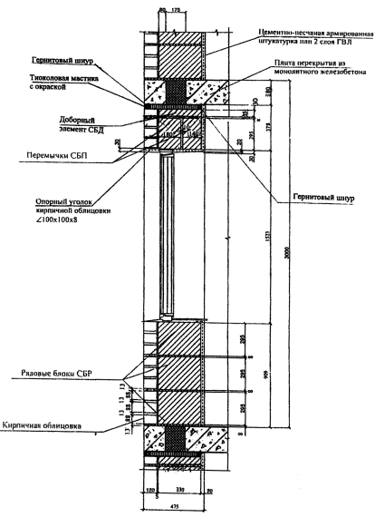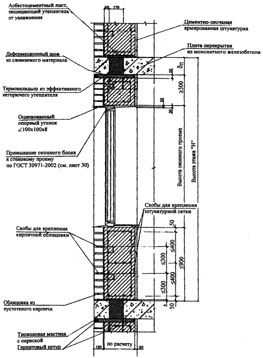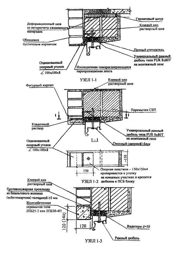 толщиной Кирпичная кладка и полистиролбетонные блоки отстоят друг от друга на расстоянии 5 мм, и между ними может предусматриваться: воздушный зазор (что улучшает теплозащитные свойства и экономические показатели стены) или кладочный клей (раствор), необходимость в котором определяется как требованиями пожарной безопасности, так и требованиями по обеспечению сопротивления ветровым нагрузкам. Поэтому воздушный зазор между кладками должен предусматриваться на максимально возможной площади глухой части фасада здания, но не более 3м2. Штукатурные слои из цементно-песчаного раствора толщиной 20 мм (на откосах - 30 мм) армированы стальной сеткой из проволоки Ø 1...1,2 мм с ячейкой 10...20 мм. Облицовка внутренней стороны гипсоволокнистыми листами (ГВЛ) толщиной 10 мм состоит из двух слоев общей толщиной 20 мм на внутренних участках стен или трех слоев общей толщиной 30 мм на откосах (см. рис. Нормаль 12-4.). Крепление штукатурных слоев и ГВЛ к полистиролбетонным блокам показано в нормали Н12. Полистиролбетонные перемычки крепятся к фасадной кирпичной кладке кладочным клеем или раствором без воздушного зазора. Толщина блоков 295, 330 или 375 мм выбирается исходя из результатов расчетов стен по прочности на ветровое давление и по теплозащите. При обеспечении требований по сопротивлению ветровому давлению и теплозащите, предпочтение по экономическим соображениям должно отдаваться блокам толщиной 295 мм. В подоконной части стены при толщине блоков 295 мм укладываются два ряда рядовых блоков СБР6 (СБР7) и один ряд доборных элементов СБД21, при толщине блоков 330 мм высотой 295 мм - три ряда рядовых блоков СБР14 (СБР15) и высотой 395 мм - два ряда рядовых блоков СБР16 (СБР17), а при толщине блоков 375 мм - три ряда блоков СБР6 (СБР7). В надоконной части стены укладываются две равновысокие полистиролбетонные перемычки шириной 140 (180) мм и высотой 295 (235) мм с замкнутой воздушной прослойкой между ними. На перемычки для стен из блоков толщиной 330 и 375 мм укладываются доборные стеновые элементы (Н2-1, Н2-2 и Н3). Функции верхней горизонтальной четверти проема выполняет: оцинкованный опорный уголок (Н6, узел 1-1) или фигурный кирпич, установленный на уголок (Н6, узел 1-2), или железобетонная перемычка (Н6, узел 1-3). На участке между перекрытием и верхом оконного (дверного) проема кирпичная облицовка опирается на стальной уголок 100х100х8, расположенный над проемом (Н6, узлы 1-1 и 1-2), или на железобетонную перемычку (Н6, узел 1-3). Уголок имеет опорные пластины из стального листа, привариваемого к нему на концевых участках и заходящего в горизонтальные швы кладки из полистиролбетонных элементов (блоков, перемычек) в простенках (см. узел 1-2 Н6). Опорные пластины крепятся к полистиролбетонным блокам дюбелями FUR 8х80Т. При ширине проема более 1,5 м опорный стальной уголок в обязательном порядке закрепляется в перемычку с использованием дюбеля FUR 8х80Т, устанавливаемого в середине пролета на монтажной пене, в который через раззенкованное отверстие в уголке завинчивается стальной шуруп с потайной головкой. Опорные стальные уголки (на уровне перекрытий и над проемами) применяются с обязательной антикоррозионной покраской в соответствии со СНиП 2.03.11-85. Между перекрытием и перемычками или доборными стеновыми блоками предусмотрен зазор толщиной 20-30 мм, заполненный сжимаемым негорючим материалом (например, негорю