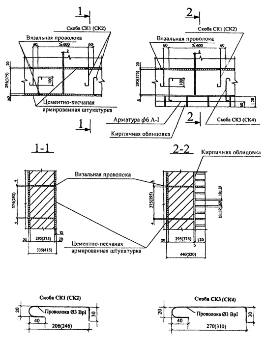 ПОЯСНЕНИЯ К НОРМАЛЯМ Н12-1 - Н12-4Нормали Н12-1 - Н12-3 дают принципиальные технические решения крепления отделочных слоев из армированной штукатурки и кирпичной облицовки к полистиролбетонным сплошным стеновым блокам, а нормаль Н12-4 крепление внутреннего слоя из гипсоволокнистых листов (ГВЛ). Крепление штукатурки и кирпичной облицовки выполняется с помощью гибких связей (анкеров) в форме скоб из проволоки Ø3 BpI. Скобы помещаются в клеевых горизонтальных швах толщиной 3-5 мм между стеновыми элементами (полистиролбетонными блоками и (или) полистиролбетонными доборными блоками) с шагом по горизонтали 600 мм и по вертикали 300...400 мм. К скобам привязываются вязальной проволокой стальная мелкоячеистая сетка из проволоки Ø 1 ...1,2 мм с ячейкой 10...20 мм, армирующая штукатурный слой толщиной 20 мм из цементно-песчаного раствора или цементно-песчано-известкового (сложного) раствора, или стальной стержень из Ø6АI, расположенный в горизонтальном растворном шве кладки из лицевого пустотелого кирпича. В горизонтальном клеевом шве каждая связь состоит из двух