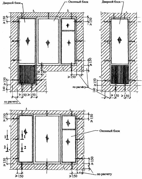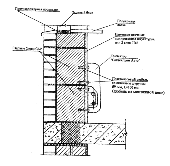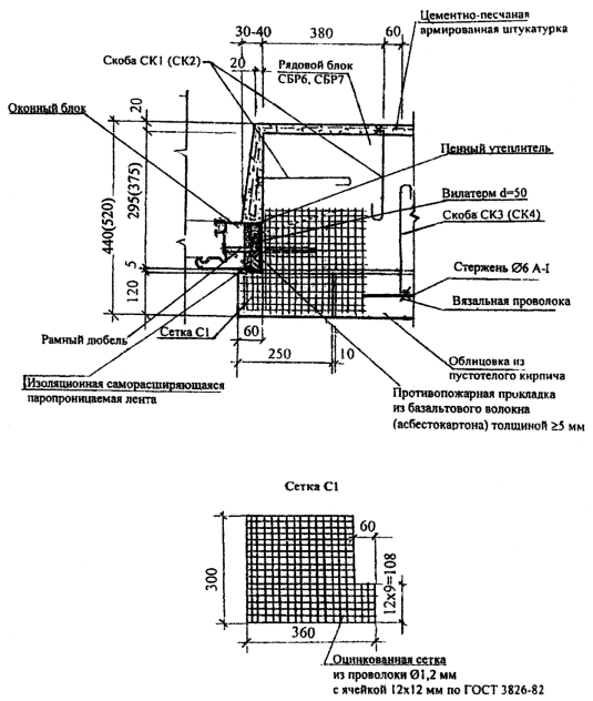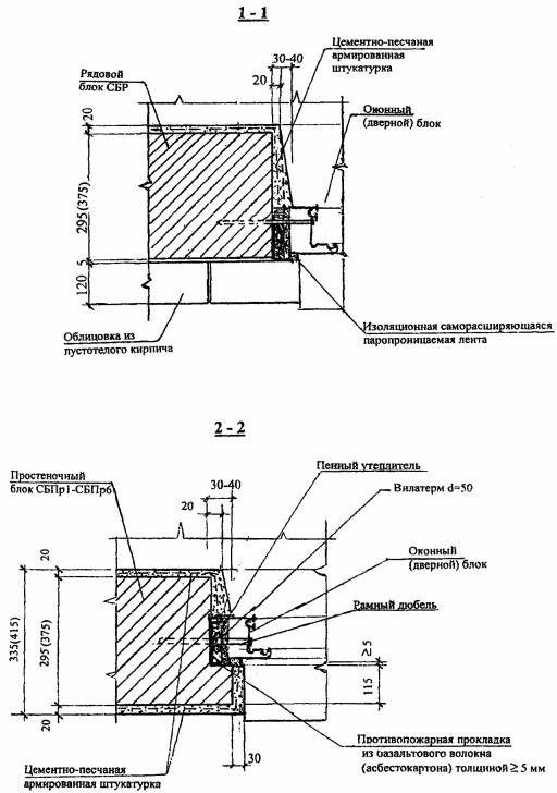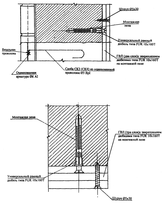 скоб, расположенных параллельно с расстоянием между ними Кирпичная облицовка, кроме того, приклеивается к полистиролбетонным блокам вертикальными и горизонтальными полосами размером 70х5 мм из клея с участками между ни ми площадью не более 3,0 м2. Таким образом, создаются замкнутые воздушные прослойки, повышающие термическое сопротивление стен, и противопожарные рассечки из клеевых полос. По условиям обеспечения сопротивления наружных стен ветровым нагрузкам (для многоэтажных зданий) возможен вариант сплошного приклеивания кирпичной кладки к полистиролбетонной стене. Такой вариант обязателен для полистиролбетонных перемычек. Штукатурные слои на откосах оконных (дверных) проемов толщиной 20...30 мм (30 мм в местах сопряжения со столярными блоками) также армируются стальной мелкоячеистой сеткой, но их крепление к полистиролбетонным блокам с помощью скоб выполняется чаще, чем на остальных участках стены. Крепежные элементы (скобы, анкерующие наружную отделку и стержень Ø6АI), а также стальная штукатурная сетка, расположенная в наружном (фасадном) штукатурном слое, должны быть оцинкованы. При фасадной кирпичной облицовке, если не предусматривается сплошное приклеивание кирпичной кладки к кладке из полистиролбетонных блоков, оцинкованные проволочные анкера в слое между кладками толщиной 5 (10) мм должны быть дополнительно защищены слоем клея (раствора) толщиной не менее 20 мм. Эта защита может обеспечиваться размещением анкеров в упомянутых выше противопожарных вертикальных и горизонтальных полосах шириной 50 мм, а вне таких полос - устройством специальной обмазки клеем или раствором. Четверть из кирпичной кладки в углах простеночного блока (Н12-2) усиливается оцинкованной стальной сеткой С1, размещаемой в каждом горизонтальном шве полистиролбетонных блоков и совпадающим с ним шве кирпичной кладки. Кирпичная кладка из утолщенного кирпича (Н12-3) при несовпадении швов с кладкой из полистиролбетонных блоков также анкеруется скобами из проволоки Ø3 ВрI, которые устанавливаются в пропил пустотелого кирпича. Пропил после установки скоб заделывается кладочным раствором. Крепление ГВЛ к стенам из полистиролбетонных блоков (Н12-4) осуществляется с помощью универсальных рамных дюбелей типа FUR 10х160Т, устанавливаемых в просверленных заранее отверстиях на монтажной пене. Крепление 2-го и 3-го слоя ГВЛ к предыдущему слою осуществляется самонарезающими винтами (шурупами) Ø5х30 мм с потайными головками. НОРМАЛЬ Н13. КРЕПЛЕНИЕ ОКОННЫХ (ДВЕРНЫХ) БЛОКОВ К СТЕНАМ ИЗ ПОЛИСТИРОЛБЕТОНА