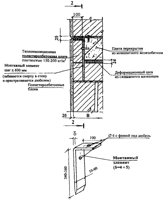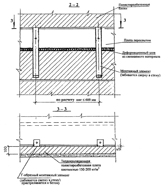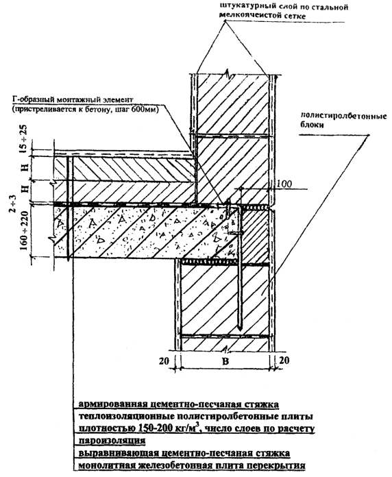 НОРМАЛЬ 14-3. КРЕПЛЕНИЕ КЛАДКИ ИЗ ПОЛИСТИРОЛБЕТОННЫХ БЛОКОВ К ЖЕЛЕЗОБЕТОННЫМ ПЕРЕКРЫТИЯМ В СТЕНАХ С ОШТУКАТУРИВАЕМЫМ ФАСАДОМ