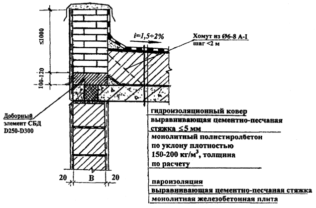 ПОЯСНЕНИЯ К НОРМАЛЯМ Н17-Н19Нормали Н17 - Н19 дают технические решения утепления кровельных покрытий зданий, чердачных перекрытий и перекрытий над холодными подвалами (подпольями, проезда ми) из монолитного полистиролбетона и полистиролбетонных теплоизоляционных плит. Для утепления используется полистиролбетон плотностью 150-200 кг/м3, марки по прочности на сжатие М2-М5. Толщина теплоизоляционного слоя (число слоев теплоизоляционных плит) определяется теплотехническим расчетом по СНиП 23-02-2003 "Тепловая защита здания" и МГСН 2.01-99 "Энергосбережение в зданиях". Гидроизоляционный ковер кровельного покрытия укладывается по теплоизоляционному слою из монолитного полистиролбетона с выполнением выравнивающей растворной стяжки толщиной не более 5 мм. Использование монолитного полистиролбетона позволяет организовать уклоны для внутреннего водостока (Н17). Для сведения к минимуму потерь тепла из внутреннего помещения под железобетонным перекрытием через кирпичный парапет предусматривается использование полистиролбетонных доборных элементов толщиной 100-120 мм плотностью D250-D300, на которые опирается кирпичная кладка парапета. Для обеспечения устойчивости кирпичного парапета используются хомуты из стальной проволоки Ø6-8 A-I одним концом закрепляемые в горизонтальном шве кирпичной кладки, а другим - крепящиеся дюбелями к железобетонному перекрытию. Шаг хомутов не более 2 м. При утеплении полистиролбетоном перекрытия неотапливаемого чердака на теплоизоляционный слой укладывается армированная растворная стяжка толщиной 15-25 мм, распределяющая на полистиролбетон нагрузку от людей и оборудования в чердачном помещении (Н18). Нагрузки от людей и оборудования, передаваемые на перекрытие над неотапливаемым подвалом (холодным подпольем, проездом), могут быть значительными. Поэтому по теплоизоляционному слою из полистиролбетона плотностью D200 требуется выполнение армированной цементно-песчаной стяжки толщиной 40...50 мм (Н19). Во всех приведенных вариантах теплоизоляционный слой из полистиролбетона укладывается на железобетонное перекрытие по слою пароизоляции, предохраняющей полистиролбетон от увлажнения. НОРМАЛЬ Н20. УЗЛЫ ОПИРАНИЯ КИРПИЧНОЙ КЛАДКИ И КРИВОЛИНЕЙНОЙ ПЕРЕМЫЧКИ В ЗДАНИЯХ С КРИВОЛИНЕЙНЫМ (Rкр<12 м) ФАСАДОМ (ВЕРТИКАЛЬНЫЙ И ГОРИЗОНТАЛЬНЫЙ РАЗРЕЗЫ)