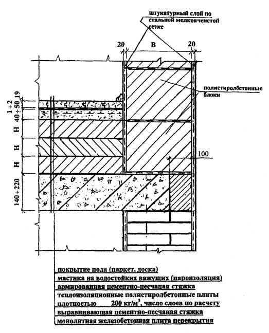 полистиролбетонным блокам с маркой по средней плотности D250, оштукатуренных цементно-песчаным раствором Ml00 толщиной 20-25 мм по стальной сетке из проволоки 0