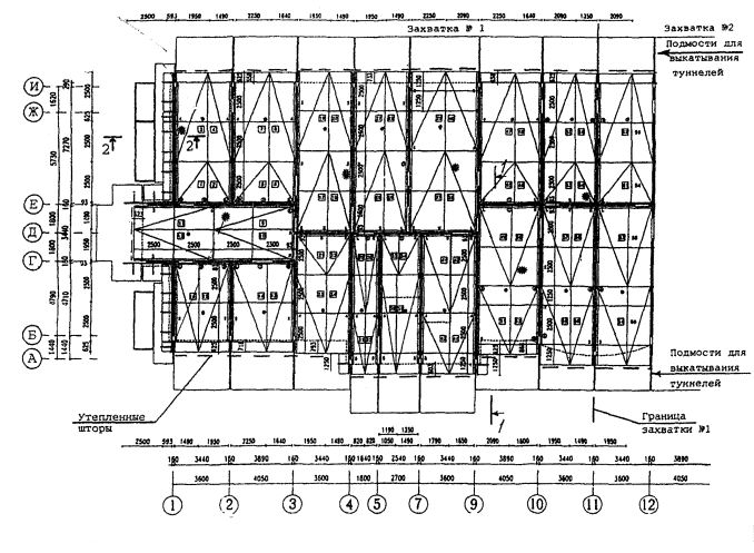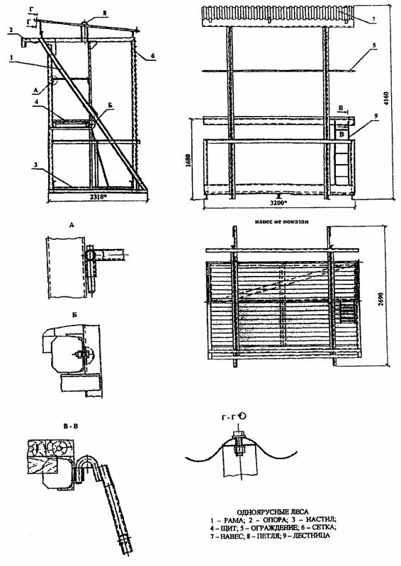 Приложение 7 представляет собой извлечение из Инструкции по применению навесных монтажных лесов для производства работ на фасадах строящихся зданий 522541-002-02495276-98 ЦНИИОМТП и МНИИТЭП. Леса могут выполняться двух типов: одноярусными и двухярусными. Тип и конструкция навесных монтажных лесов определяется конструкцией здания и его несущих элементов, видом выполняемых работ. Одноярусные навесные монтажные леса представляют собой раму с опорами, взаимодействующими с элементами здания. На раме предусмотрены рабочие настилы в виде щита, кроме того, на высоте 1,5 м устанавливается промежуточный щит (настил). Ограждение представляет собой пространственную каркасную сварную конструкцию из швеллеров и уголков. С наружной стороны лесов устанавливается защитная металлическая сетка Монтаж и демонтаж лесов производится грузоподъемными кранами (башенными, стреловыми) с строповкой как обычным канатным двухветвевым стропом, так и с помощью специальных траверс. При монтаже лесов на зданиях должны быть предусмотрены проемы в стене, в которые монтируются опорные кронштейны, фиксируемые в проемах посредством деревянных клиньев. В проем стены вставляется упорная прокладка. Стены, в которых устраиваются отверстия, должны быть рассчитаны на нагрузку от лесов, с учетом их загрузки материалами, оборудованием и людьми согласно проекту производства работ. Рама лесов должна быть рассчитана на прочность от нагрузки и собственного веса. В соответствии с конструктивной характеристикой здания и шагом несущих внутренних стен разрабатывается необходимое количество типоразмеров навесных монтажных лесов, отличающихся друг от друга только продольными размерами платформ. Навесные монтажные леса оборудуются ограждениями, в торцах могут устраиваться переходы на соседние леса. Поверх лесов устраивают съемное покрытие из сплошного профнастила. Внутри лесов устраивают несколько промежуточных настилов из досок толщиной 50 мм. Зазор между промежуточными настилами и возводимой наружной стеной должен составлять 50 мм. Крепление монтажных лесов может осуществляться двумя вариантами. Первый вариант - крепление за перекрытие посредством опорных кронштейнов и анкеров. Отверстия в перекрытиях в этом случае необходимо образовывать во время бетонирования, согласно проекта и производства работ. Второй вариант крепления лесов - за внутренние несущие стены. Крепление производится помощью кронштейнов и пальцев. Подъем и установку лесов производят автомобильным или башенным краном за специальные петли. Подачу грузов на навесные леса производят после их окончательного закрепления. Кирпич, раствор, арматурные сетки в рабочую зону подают краном. Монтаж и подачу оконных перемычек производят краном. Рабочее место звена каменщиков, маляров и других рабочих включает участок, возводимый стены и часть навесных лесов, где размещаются материалы и находятся рабочие. Ширина рабочего места должна располагаться между несущими подкосными рамами. На консолях навесных лесов размещать грузы запрещено. Рабочая зона должна составлять 0,6-0,7 м. ПРИЛОЖЕНИЕ 8. ПОДМОСТИ КОНСТРУКЦИИ ЗАО «ЖИЛСТРОЙ»