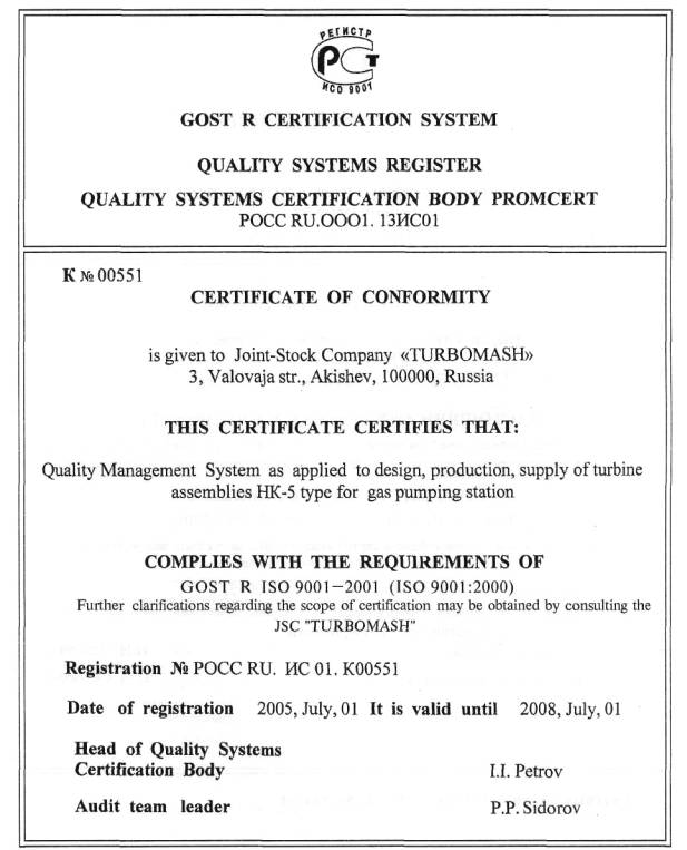 на соответствие требованиям ГОСТ Р ИСО 9001-2001 (ИСО 9001:2000) применительно к
