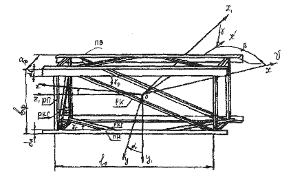 Рис. 2.5. Схема отсека фермы где Апн, Апв, Арк, Арп, Аркг, Аркс - характерные площади стержней отсека, соответственно нижнего и верхнего поясов, раскосов, распорки, раскоса горизонтальной грани, раскоса в поперечном сечении, м2, определяемые по формулам (2.7) Апн
