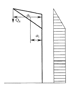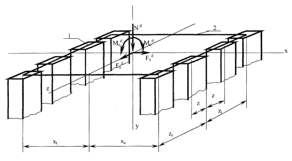 для проводов контактной сети 2.18. Коэффициент надежности по ветровой нагрузке, передаваемой с проводов на опорные, поддерживающие и фиксирующие устройства контактной сети, следует принимать равным: а) при расчете по прочности - 1,3; б) при расчете по деформациям - 1,0; в) при расчете по образованию трещин в железобетонных опорах - 0,75. Коэффициент надежности по ветровой нагрузке на опорные, поддерживающие и фиксирующие конструкции следует принимать равным 1,2. Расчет проводов выполняют на нормативное значение средней составляющей ветровой нагрузки, умноженному на коэффициент 1,10. 2.19. При определении ветровой нагрузки на провода и конструкции контактной сети надо принимать следующие значения аэродинамического коэффициента лобового сопротивления Сх: а) одиночные провода и тросы диаметром 20 мм и более - 1,10; б) то же диаметром менее 20 мм и также провода и тросы, покрытые гололедом - 1,20; в) одиночные контактные провода и тросы цепной подвески с учетом зажимов и струн - 1,25; г) двойные контактные провода с расстоянием между ними 40 мм на нулевых местах и на насыпях высотой до 5 м - 1,55, то же на насыпях более 5м - 1,85; д) железобетонные опоры кольцевого и круглого сечения - 0,7; е) ригели жестких поперечин по пп. 2.20 - 2.23 Норм; ж) плоские элементы конструкций - 1,4. 2.20. Расчет ветровых нагрузок на ригели жестких поперечин следует выполнять в соответствии с рекомендациями СНиП 2.01.07 и дополнительными рекомендациями пп. 2.21 - 2.23 Норм. 2.21. Ветровые нагрузки на ригели жестких поперечин необходимо определять для отсека фермы и приводить затем к нагрузке на 1 м. За отсек принята часть фермы, заключенная между двумя поперечными сечениями на длине панели и характеризующаяся схемой решетки и геометрическими параметрами, которые повторяются по длине фермы (рис. 2.5). 2.22. Горизонтальную расчетную нагрузку на отсек ригеля Х1, Н, определяют при действии ветра вдоль пути: X1 = Cx·A·qнз·γf, где γf коэффициент надежности по ветровой нагрузке, принимаемый равным 1,2; А - характерная площадь с наветренной стороны отсека фермы (м2), определяемая для четырехгранных ферм по формуле: А = Апн