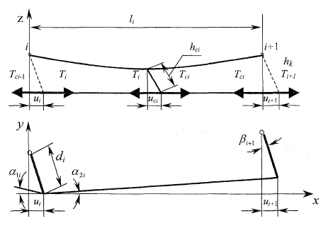 = MДcos βк (2.18) где МД - изгибающий момент в плоскости действия равнодействующей силы. 2.59. Нагрузку на конструкции контактной сети при обрыве несущего троса определяют для заданного типа контактной подвески, района по гололеду и длин пролетов. Для определения вертикальных сил, действующих при обрыве, следует принимать толщину стенки гололеда, равную 0,5 максимальной расчетной для данного района. 2.60. Расчет нагрузок на ригель жесткой поперечины в аварийном режиме следует выполнять для случая обрыва несущего троса в середине пролета контактной подвески одного из главных путей, дающего наиболее невыгодные сочетания и наибольшие величины действующих сил.