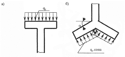 где А0 - поверхность отсека, подверженная обледенению, м2: Ао = 0,6А. Здесь А - полная поверхность отсека фермы, м2: А = A'пнnпн + A'пвnпв + A'ркnрк + A'рпnрп + A'ркгnркг + A'рпгnрпг + A'рксnркс; A'пн, A'пв, A'рк, A'рп, A'ркг, A'рпг, A'ркс - составляющие общей площади А поверхности отсека, соответственно, нижнего пояса (пн), верхнего пояса (пв), раскоса (рк), распорки (рп), раскоса горизонтальной грани (ркг), распорки горизонтальной грани (рпг), раскосов в поперечном сечении фермы (ркс); nпн; nпв; nрк; nрп; nркг; nрпг; nркс - число поясов нижних, верхних, раскосов и распорок на вертикальных гранях, раскосов и распорок на горизонтальных гранях, а также раскосов в поперечных сечениях отсека фермы (соответственно). Снеговые нагрузки на ригель жесткой поперечины 2.39. При определении снеговой нагрузки на ригель жесткой поперечины следует руководствоваться указаниями СНиП 2.01.07 и учитывать дополнительные требования Норм. 2.40. Нормативное