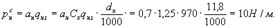 где αн - коэффициент, учитывающий неравномерность давления ветра вдоль пролета, принимаемый равным: при давлении ветра до 400 Па - 0,9; от 401 до 650 - 0,8; от 651 до 1000 - 0,7; более 1001 Па - 0,65; при механическом расчете проводов и длин пролетов αн = 1.