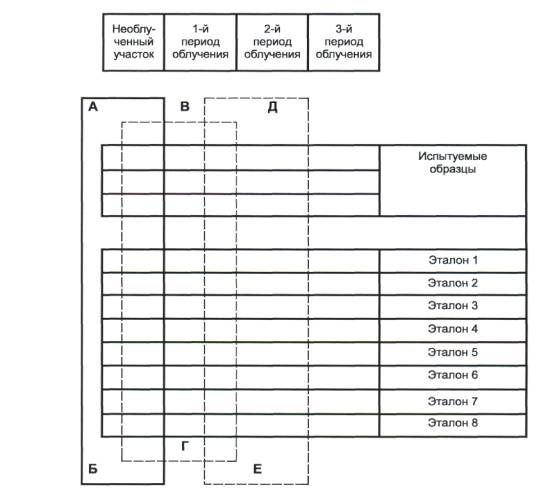 (6.2.1) после облучения их с использованием светонепроницаемых покрытий. Образцы и образец-эталон располагают так, как показано на рисунке 1,