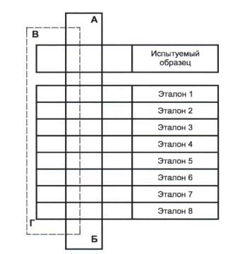 АБ - покрытие, закрывающее среднюю часть образца и синих эталонов; ВГ - второе покрытие Рисунок 2 - Схема расположения испытуемого образца, синих эталонов и покрытий по методу 3 6.2.5.2 Образцы и синие эталоны располагают так, как показано на рисунке