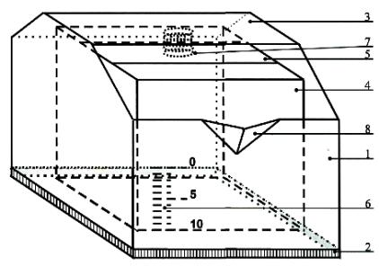 Прибор (рисунок Е.1) состоит из короба 1, обрамленного снизу уплотнительным элементом 2, предотвращающим вытекание воды из прибора. В верхней части короба расположена ручка 3. Внутрь вставлен поршень с плоским дном 4 и ручкой 5 наверху. Между стенками поршня 4 и короба 1 имеется зазор определенной величины. На одной из боковых граней поршня нанесена шкала 6, позволяющая по уровню воды измерять среднюю глубину впадин шероховатости в пределах от 0 до 10 мм. Между ручками 3 короба 1 и 5 поршня 4 установлена пружина 7.