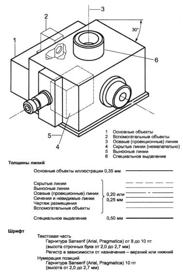 АБВГ.ХХХХХХ.014РЭ. Для изделий, требующих особой осторожности при обращении с ними, на обложке формуляра (паспорта) должна быть нанесена предупреждающая надпись, например, «ВНИМАНИЕ! ОСОБАЯ ОСТОРОЖНОСТЬ», а в тексте формуляра (паспорта) даны необходимые пояснения. 6.6 Все надписи (обозначения) и условные знаки, располагаемые на изделии и на фирменных табличках к изделию, должны быть приведены и описаны в документации. 6.7 Все встречающиеся в тексте примеры надписей на пультах, приборных досках и фирменных табличках, трафаретные наименования переключателей и их положений: команды, режимы работы, сигналы и т.п. должны быть выполнены в ЭД прописными буквами и заключены в кавычки. 6.8 При издании ЭД на иностранном языке текст выполняют с учетом требований международных стандартов на техническую документацию. Для изделий, поставляемых на экспорт, ЭД комплектуют без листов утверждения. 6.9 При поставке изделий на экспорт непосредственно из эксплуатирующих организаций ЭД оформляют согласно настоящему стандарту и дополнительным указаниям потребителя для этих организаций. 6.10 Для обеспечения наглядности, облегчения восприятия содержания излагаемого текста и его пояснения применяют различные табличные формы и графические иллюстрации. 6.11 Иллюстрации следует подготавливать в векторном (штриховом) виде. Допускается при согласии заказчика использовать тоновые иллюстрации (фотографии) при условии, что они удовлетворяют требованиям по ясной визуализации деталей. 6.12 В качестве иллюстраций следует использовать следующие типы векторных изображений: - аксонометрические изображения. Наиболее наглядный трехмерный вид представления деталей, агрегатов, узлов (см. рисунок Б.1, приложение Б); - перспективные изображения. Обычно используют только для очень больших агрегатов. Перспективные изображения также допускается использовать для схем размещения; - ортогональные изображения. Используют в случае, если этот тип иллюстрации дает наглядное представление. В тех случаях, когда детали или порядок разборки могут быть однозначно идентифицированы с помощью вида сверху, такое представление также может быть использовано в качестве иллюстрации. Эта форма рекомендуется для монтажных и электрических схем и т.д.; - диаграммы/схемы. Эти типы представления используют для пояснения работы систем (например, гидравлической) или схем (например, электрической и т.д.); - графики. Эти типы представления предназначены для показа отношений между различными параметрами; - чертежи. 6.13 Во всех иллюстрациях следует соблюдать однообразие графического исполнения, оформления и принятых условных обозначений. Общие требования к выполнению элементов иллюстраций приведены в приложении А. 6.14 При выполнении иллюстраций соблюдают следующие общие правила: - иллюстрации должны быть расположены как можно ближе к соответствующим частям текста, а количество иллюстраций должно быть достаточным для правильного понимания текста; - иллюстрации должны быть представлены в виде и масштабе, наиболее благоприятном для восприятия, а, в случае необходимости, для наглядности должны быть использованы схема размещения и/или указатели направления; - иллюстрации должны быть достаточно наглядными и простыми и иметь только необходимую информацию, непосредственно относящуюся к тексту. Сле