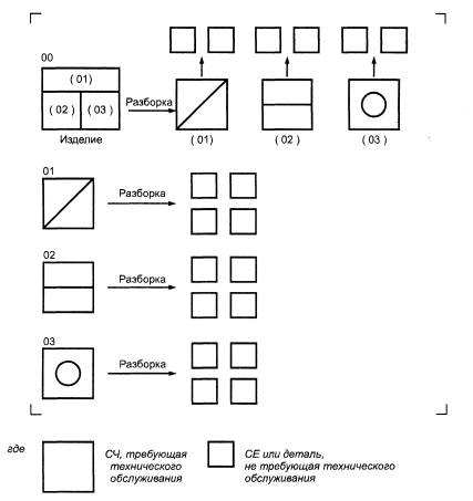 В этом случае все три СЧ, подлежащие дальнейшему обслуживанию, следует пронумеровать в соответствии с правилами, приведенными в перечислениях 1)-4). Им будут присвоены номера 01, 02, 03, и для каждого из них будет создан свой модуль данных, в обозначении которого будет иметься номер объекта разборки 01, 02 или 03. В ходе работ указанные объекты разборки будут разобраны на СЕ и детали, над которыми операции технического обслуживания не проводят, поэтому МД для них не создают.
