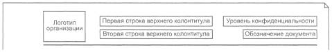 Д.3 Верхний колонтитул состоит из следующих элементов: двух текстовых строк, обозначения документа, уровня конфиденциальности и логотипа предприятия (необязательно). Каждая из строк может содержать: