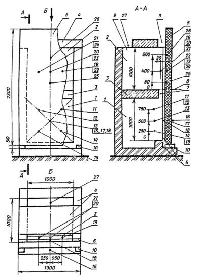1 и 2 (размеры указаны справочно). 1 - огневая камера; 2 - тепловая камера; 3 - перекрытие, разделяющее огневую и тепловую камеры; 4 - ограждение тепловой камеры; 5 -образец; 6 - уплотнение; 7 - проем между обогреваемой поверхностью образца и торцом перекрытия 3; 8 - граница тепловой камеры и контрольной зоны образца; 9 - проем для выхода газов; 10 - прокладка; 11-27 - термопары для измерения температуры конструкции и газовой среды в огневой и тепловой камерах Рисунок 1 - Схема печи для испытаний