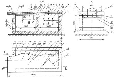вертикальных конструкций 1 - огневая камера; 2 - тепловая камера; 3 - перегородка, разделяющая огневую и тепловую камеры; 4 - ограждение тепловой камеры; 5 -образец; 6 - уплотнение; 7 - проем между обогреваемой поверхностью образца и торцом перегородки 3; 8 - граница тепловой камеры и контрольной зоны образца; 9 - проем для выхода газов; 10 - прокладка; 11-27 - термопары для измерения температуры конструкции и газовой среды в огневой и тепловой камерах Рисунок 2 - Схема печи для испытаний горизонтальных конструкций