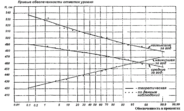 по данным таких таблиц строятся теоретические кривые обеспеченности отметок уровня моря из наивысших, средних и наинизших отметок за год (рисунок 5.1). Для контроля соответствия теоретического закона распределения на построенные кривые накладывают значения обеспеченности для различных отметок уровня моря, рассчитанные для фактического ряда наблюдений по формуле: